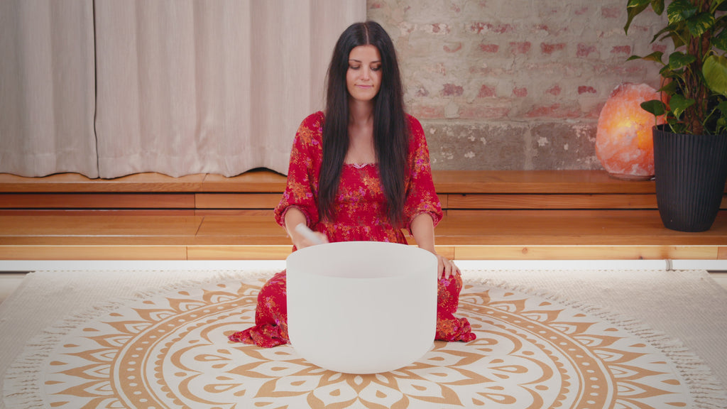 Ignite your authentic voice and bath in the captivating resonant frequency of the 432 Hz 16" Crystal Singing Bowl, specially tuned to the Heart Chakra.