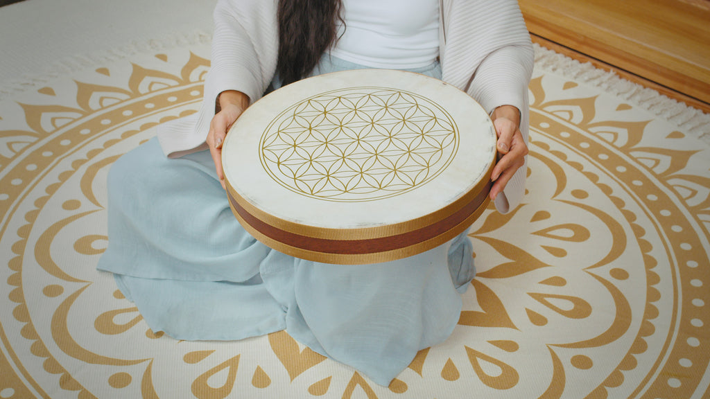 Experience the calming, healing tones of the ocean with this 16" Flower of Life Wave Drum.
