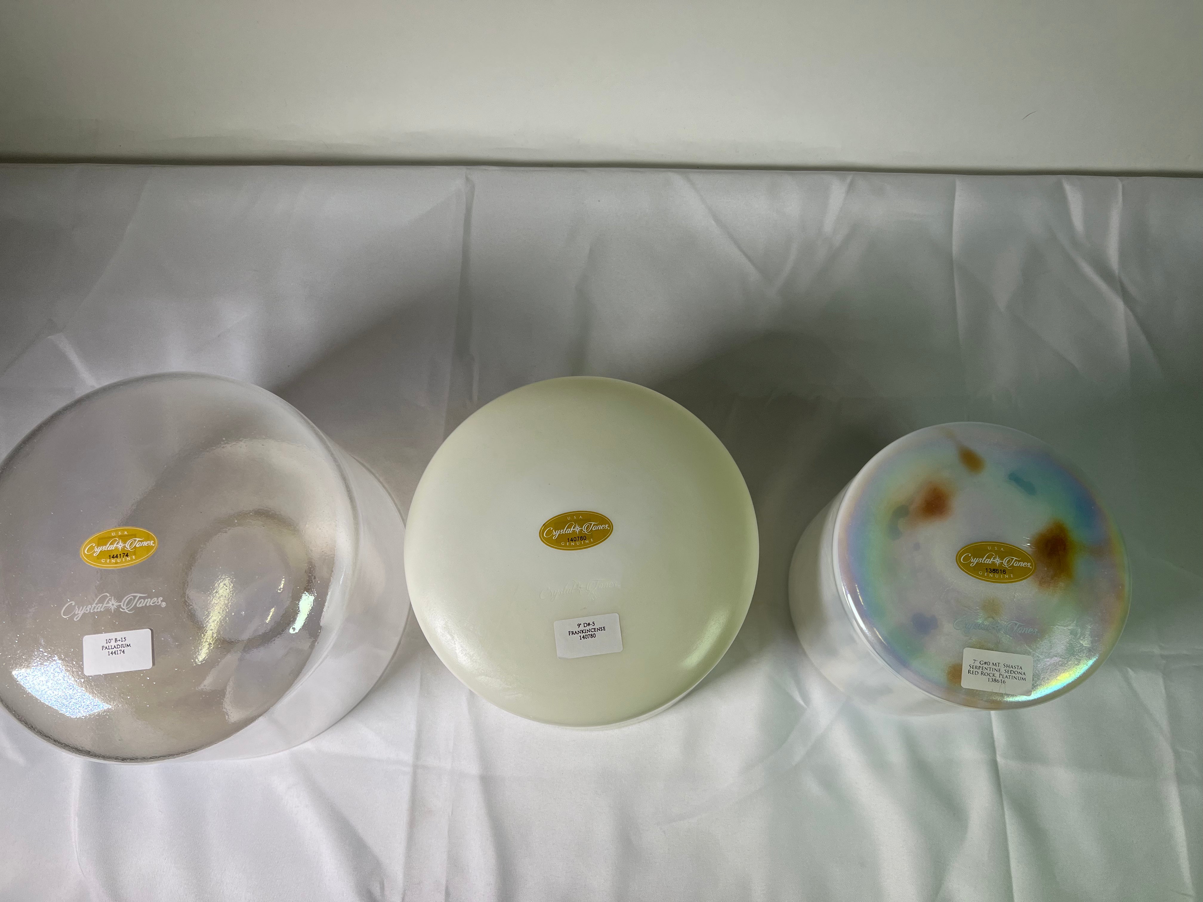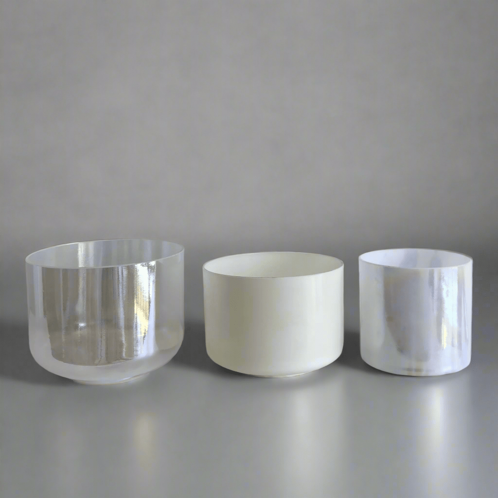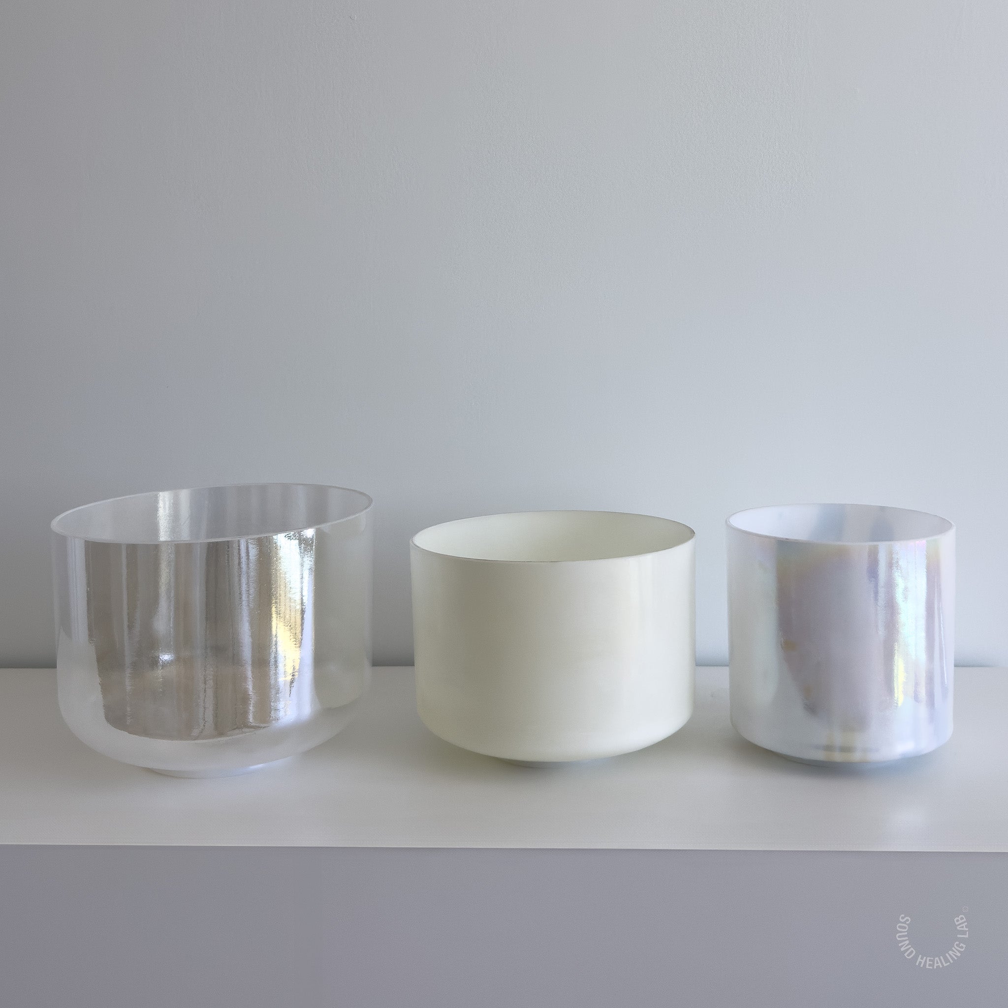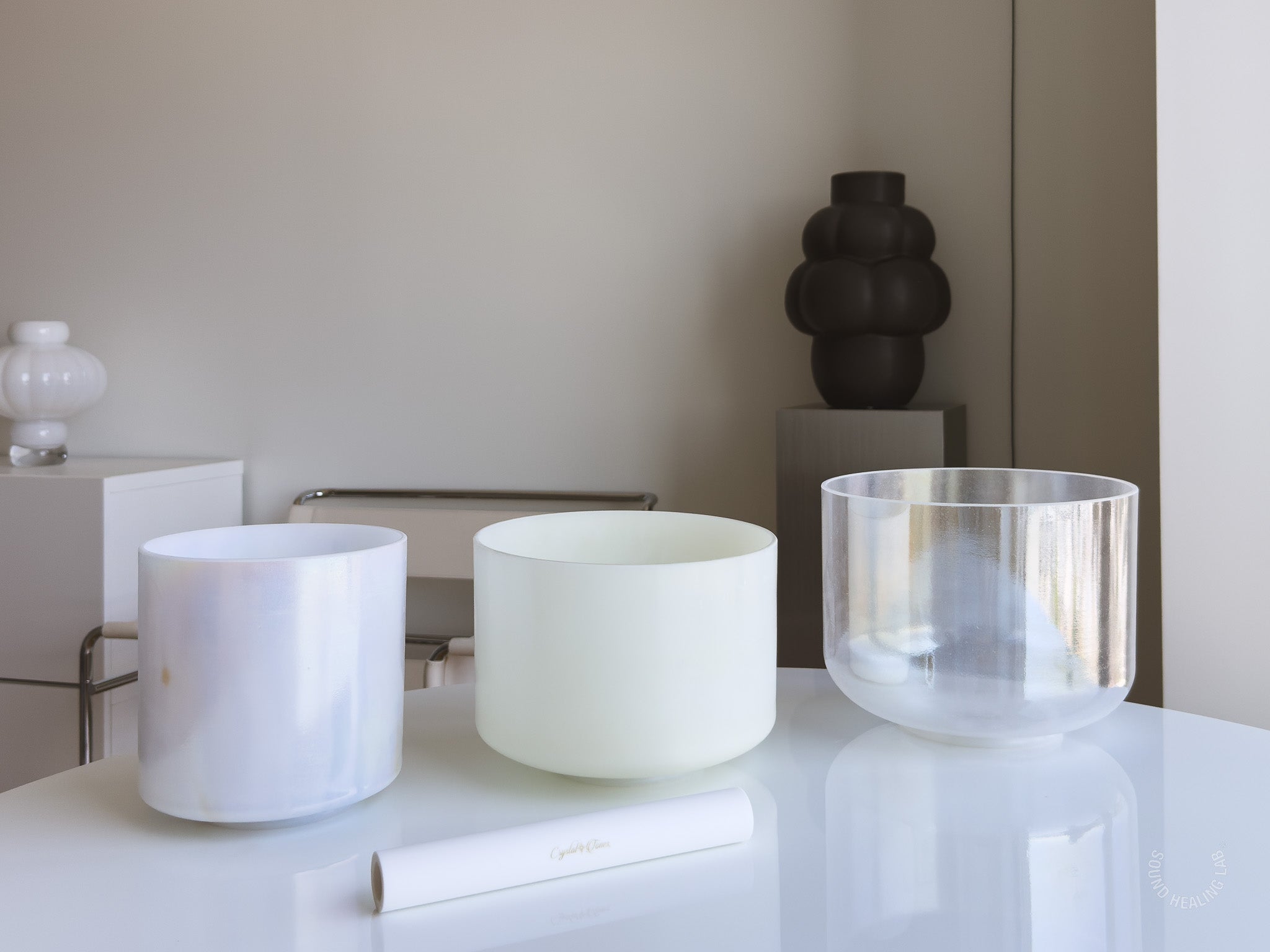 - 3 Alchemy Crystal Singing Bowls, harmonically tuned and stackable